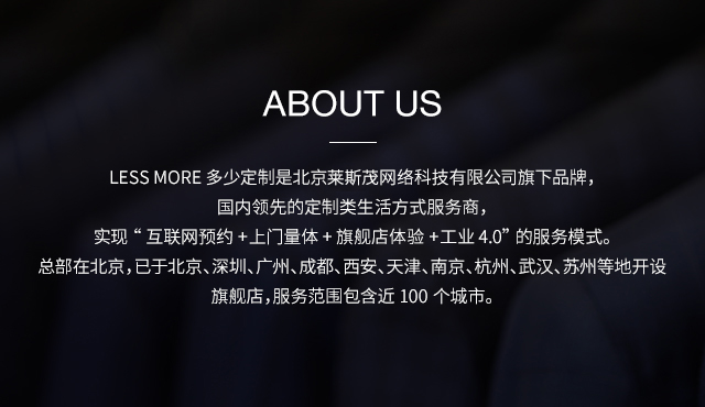 LESS MORE多少定制 2015年5月創(chuàng)立于北京,以互聯(lián)網(wǎng)思維和工業(yè)4.0切入服裝定制領(lǐng)域,獨創(chuàng)“互聯(lián)網(wǎng)預(yù)約+旗艦店體驗+免費上門量體+工業(yè)4.0 C2M生產(chǎn)”的模式,現(xiàn)已成為國內(nèi)服裝定制行業(yè)的標桿品牌。